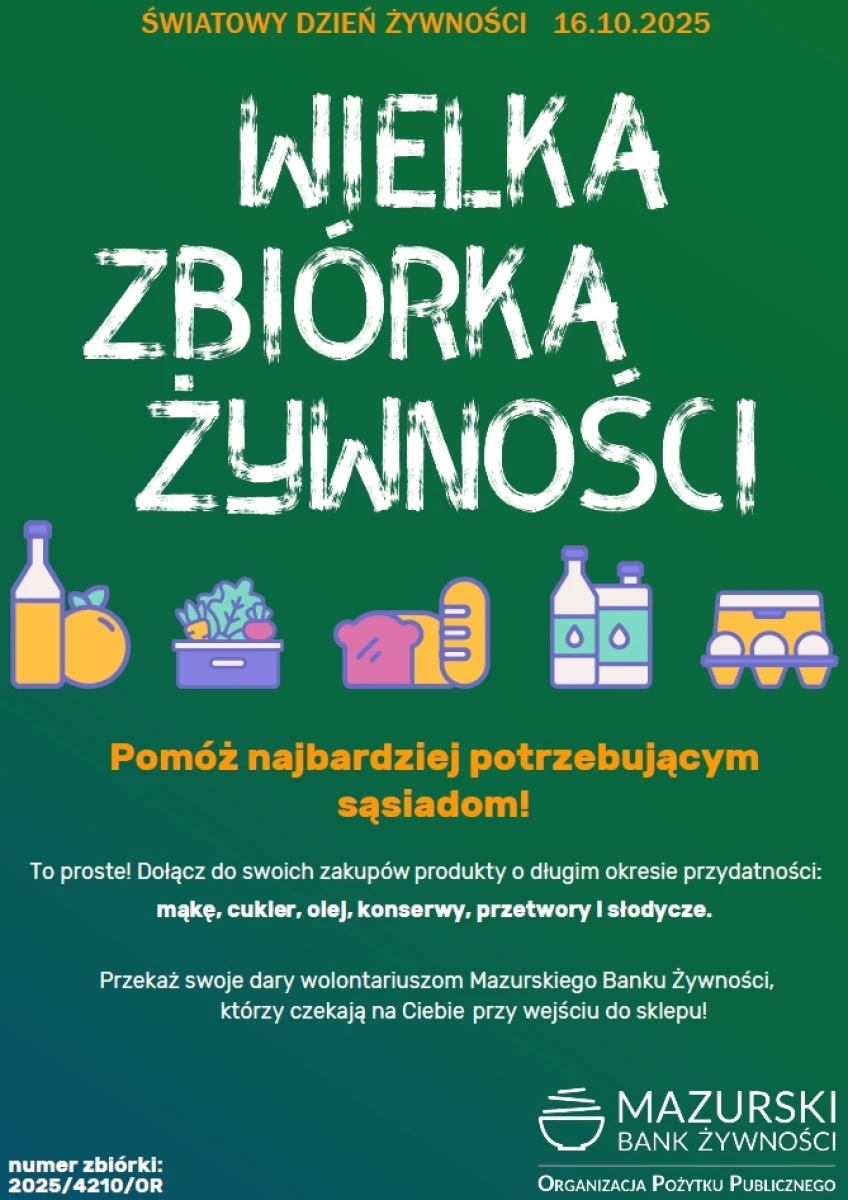 Z tej okazji Mazurski Bank Żywności po raz kolejny organizuje zbiórkę żywności, która odbędzie się 17 i 18 października w sklepach wielobranżowych na terenie powiatów piskiego i ełckiego. W akcję zaangażują się wolontariusze, którzy będą zachęcać mieszkańców do dzielenia się produktami z długim terminem przydatności.