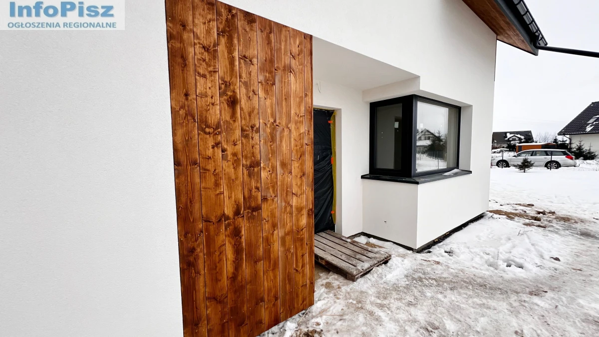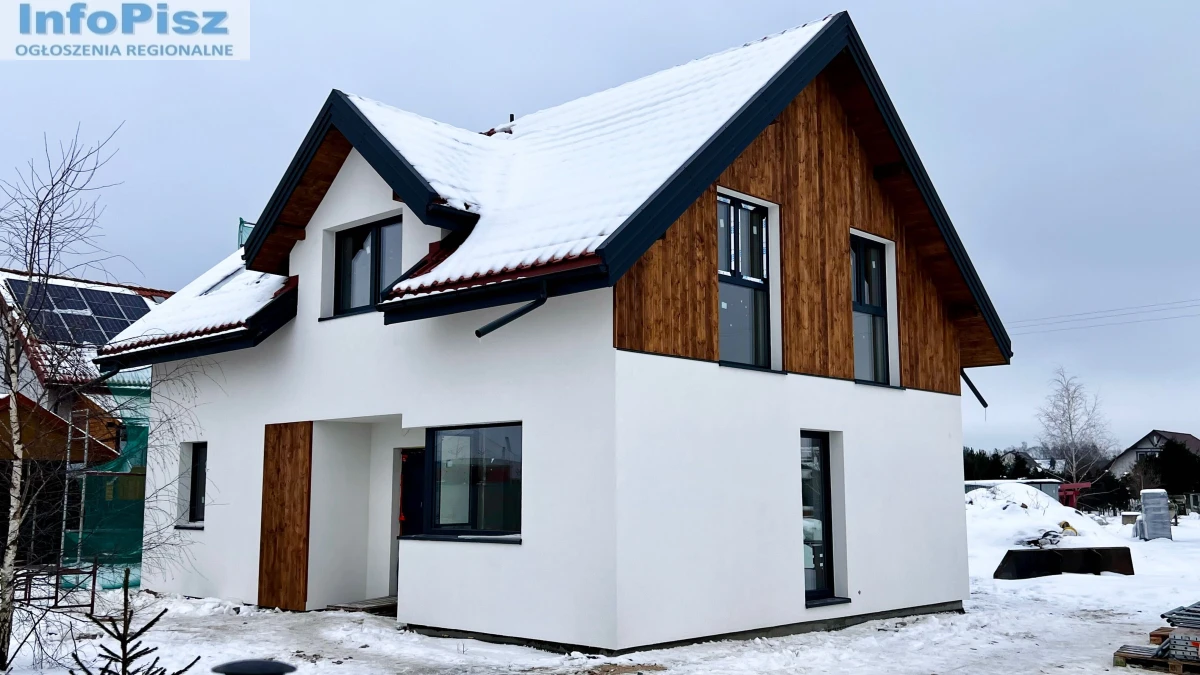 (Dom wykończony z zewnątrz, wyposażony w stolarkę okienną. Elewacja z elementami drewnianymi. Dach pokryty ceramiczną dachówką w kolorze czerwonym. Działka wokół budynku została wstępnie zniwelowana.