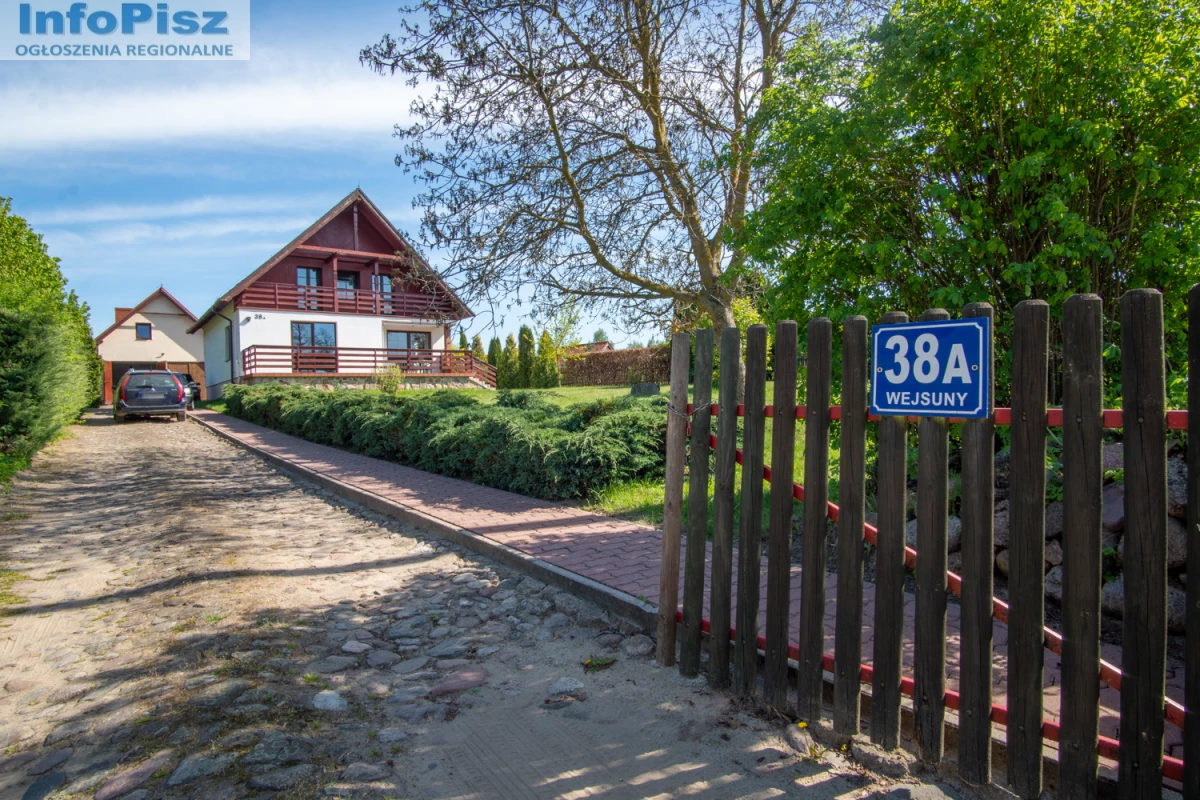 Na sprzedaż przestronny dom jednorodzinny z garażem dwustanowiskowym i niezależnym mieszkaniem na piętrze. Nieruchomość położona w malowniczej miejscowości Wejsuny, w sercu Mazur, z bezpośrednim widokiem na jezioro Wejsunek.