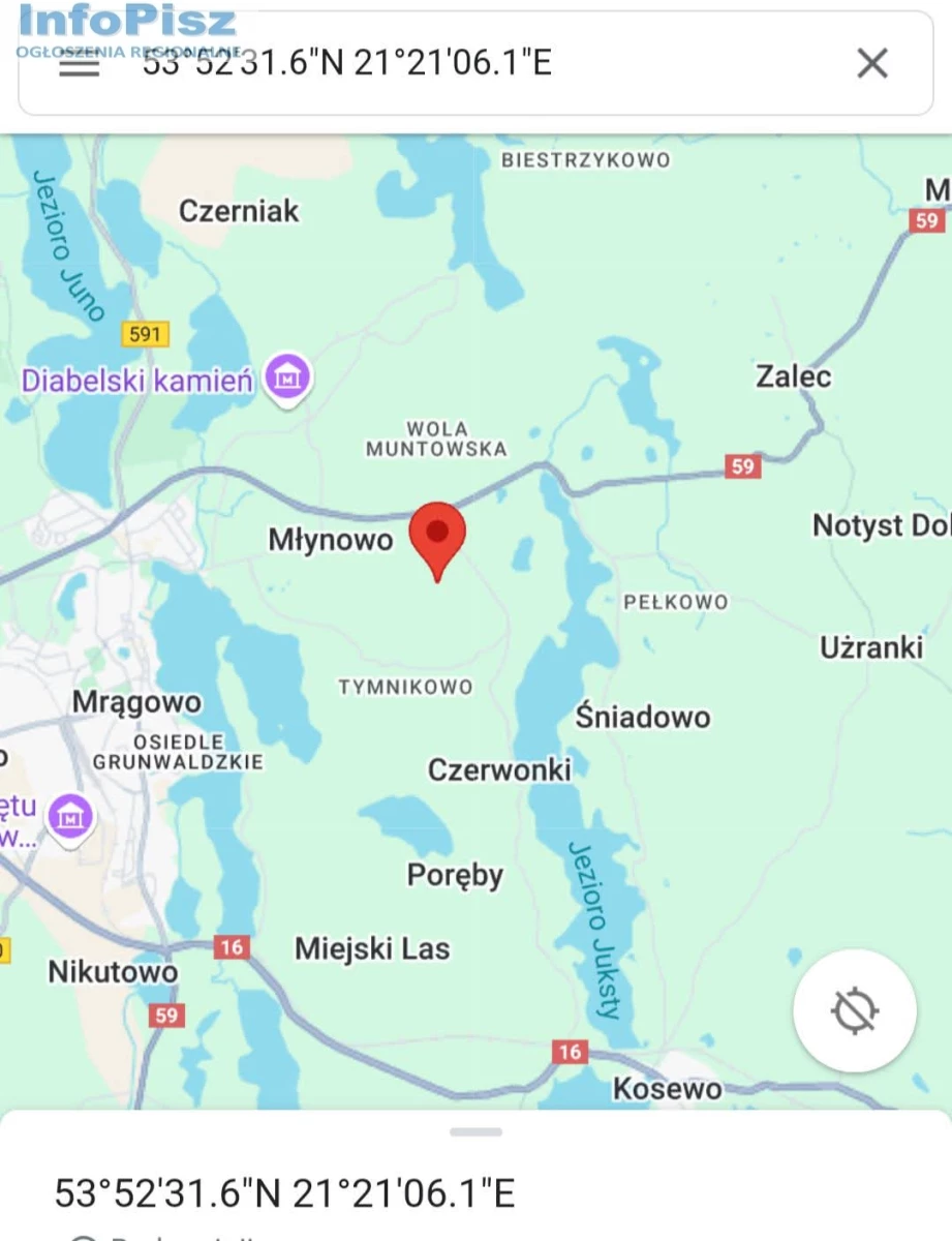 Na sprzedaż działka nr 152/25 obręb Młynowo gmina Mrągowo, zlokalizowana pomiędzy dwoma jeziorami Czos ( 1,5 km ) oraz Juksty ( 1 km ). Działka o powierzchni 3023 m2, klasoużytki LZ ( grunty zadrzewione i zakrzewione ) PSV ( pastwiska klasy V ) oraz RIVa ( rolna klasa IVa ). Odległość od Mrągowa 1,5 km. Dostęp do drogi publicznej : tak udziały w drogach wewnętrznych. Na sąsiednie działki zostały wydane warunki zabudowy pod zabudowę mieszkaniową. Prąd w odległości 200 m. Założona księga wieczysta, własność. Cena 188 tys zł. Tel 570 230 080