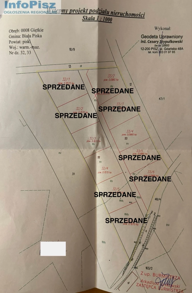 Na sprzedaż jest działka rolno-budowlana o powierzchni 10 arów (1000 m²), zlokalizowana w malowniczej miejscowości Giętkie, w gminie Biała Piska, powiecie Piski, województwie warmińsko-mazurskim.