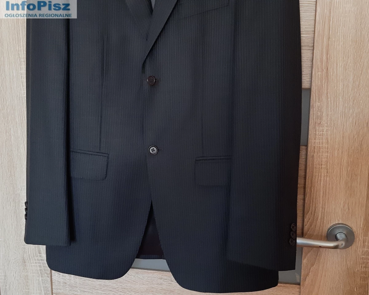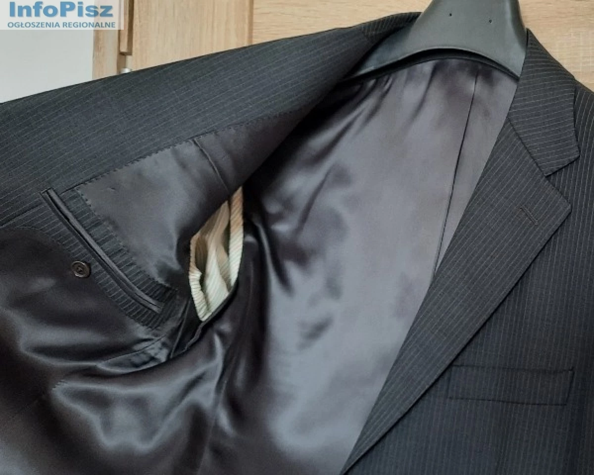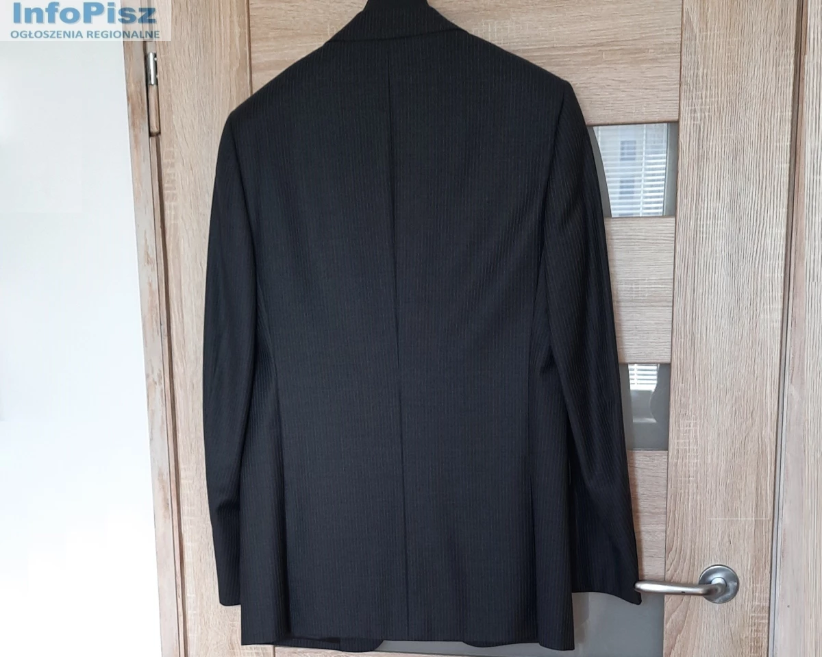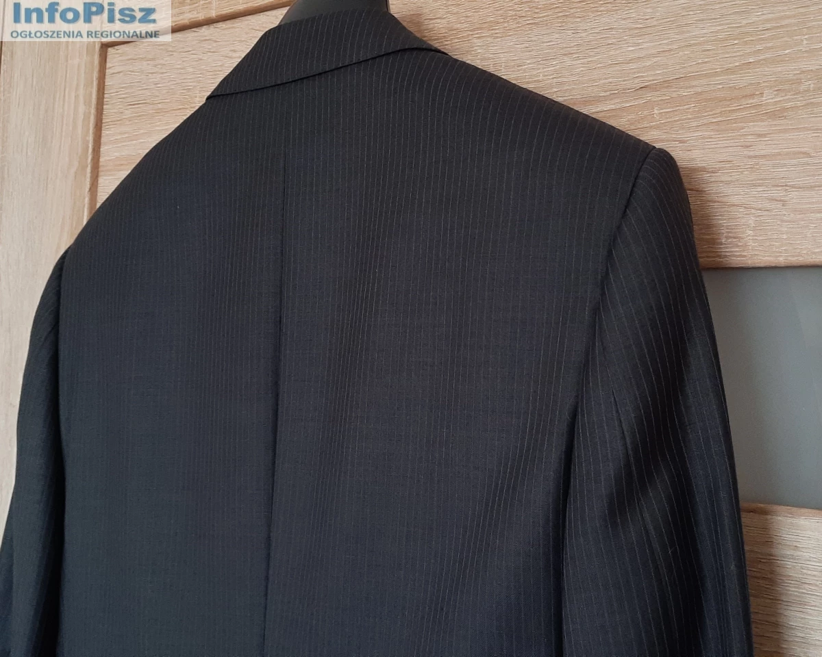 Sprzedam: efektowna męska MARYNARKA kolor: ciemnoszara, użyta okazjonalnie tylko raz, stan idealny – jak nowy! Materiał: 95% wełna i 5% poliester; na 182 cm wzrostu (182 / 96 / 82), długość rękawa ok. 69 cm, zapinana na 2 guziki, w klapie butonierka; z przodu posiada jeszcze fabrycznie zszyte: kieszonkę na poszetkę oraz dwie kieszenie zewnętrzne z patkami; wewnątrz 4 kieszenie, z tyłu marynarki dwa rozcięcia (również zafastrygowane fabrycznie), całość na doskonałej jakości podszewce. Zakupiona w sklepie firmowym, wykonana z niezwykłą starannością, bardzo elegancka, pasuje do różnych stylizacji.