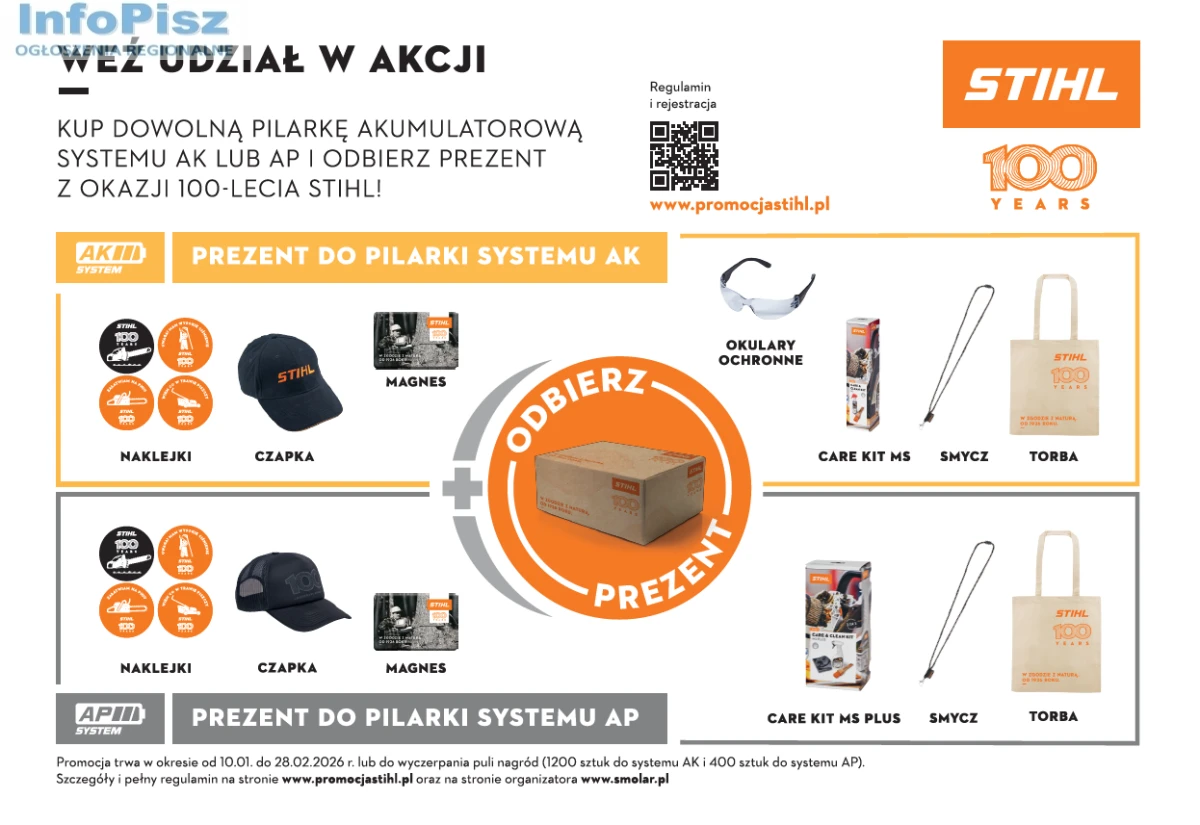 Klienci, którzy w okresie od 10 stycznia do 28 lutego 2026 roku (lub do wyczerpania puli nagród) zakupią dowolną pilarkę akumulatorową STIHL Systemu AK lub AP otrzymają prezent zawierający zestaw akcesoriów STIHL oraz gadżety zaprojektowane na nasze 100-lecie. Warunkiem wzięcia udziału w promocji jest zarejestrowanie przez Klienta zakupu na dedykowanej stronie www.promocjastihl.pl i podanie danych osobowych oraz informacji dotyczących zakupu wraz ze skanem paragonu oraz zdjęciem tabliczki znamionowej urządzenia.