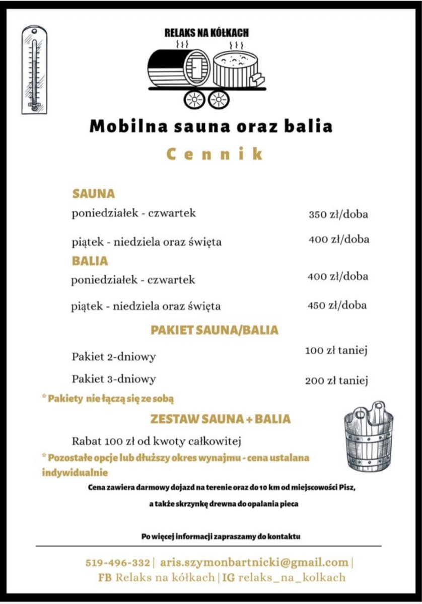 Relaks na Kolkach oferuje wynajem Sauny i Balii. Cena uwzględnia skrzynkę drewna oraz dojazd na terenie Pisza oraz w okolicach do 10 km. Zapewniamy maksymalny odpoczynek i przemiłą obsługę.