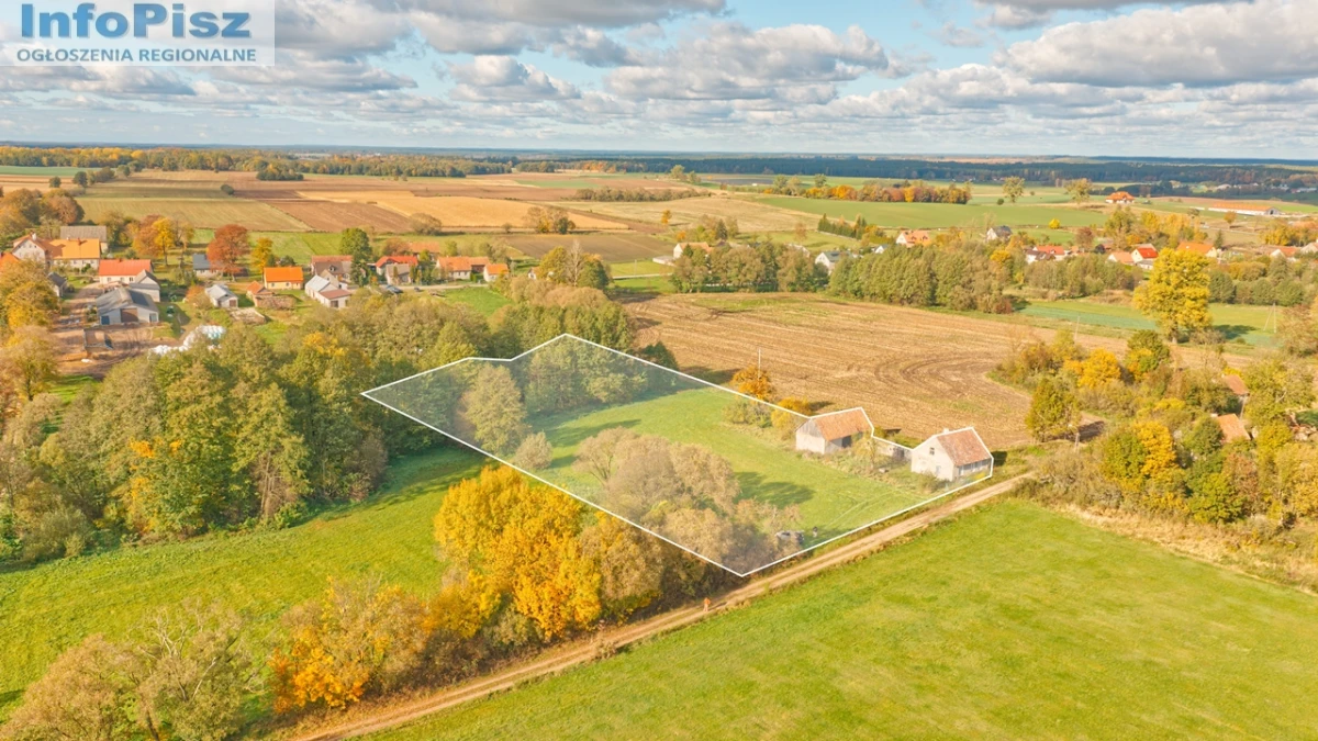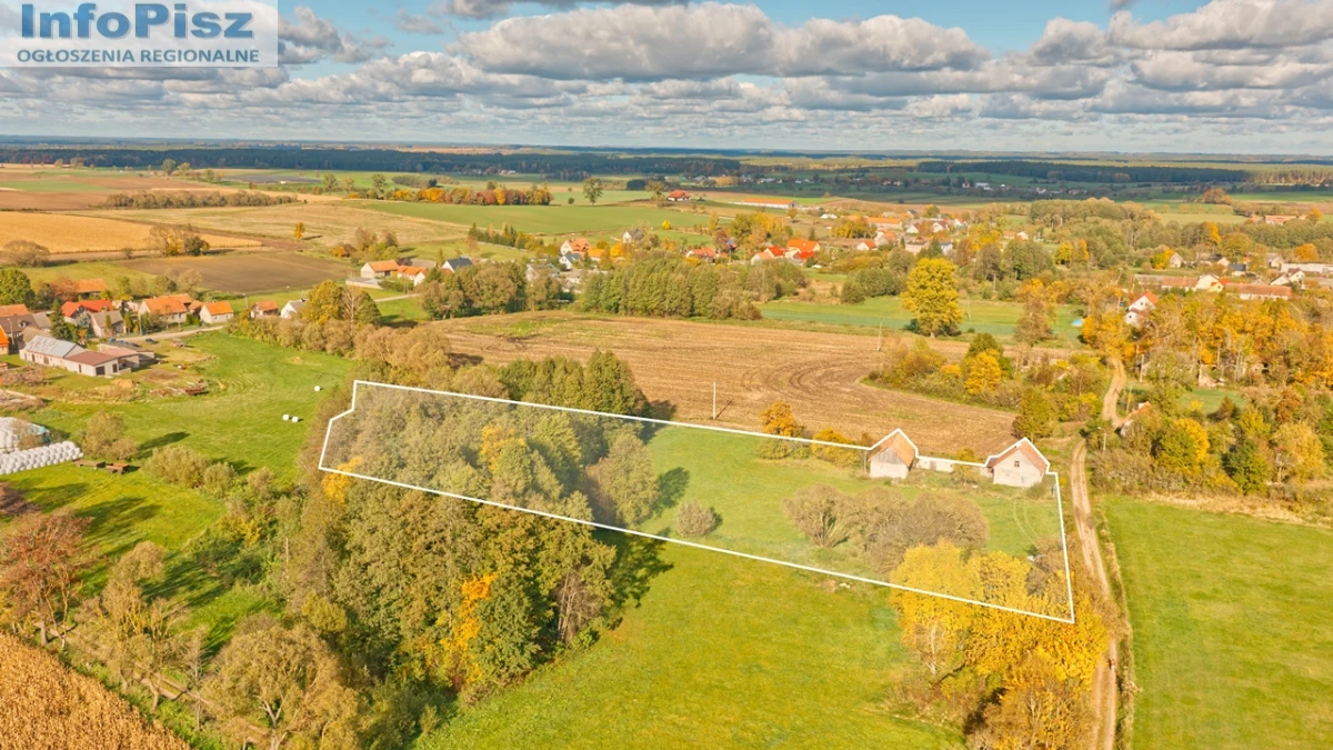 Oferowana nieruchomość obejmuje dwa budynki – dom mieszkalny oraz budynek gospodarczy – a także pozostałości trzeciego budynku, który niegdyś łączył dom ze stodołą. Całość posadowiona jest na dwóch działkach gruntu o numerach ewidencyjnych 24/2 o powierzchni 1200 m² oraz 24/3 o powierzchni 8000 m², co łącznie daje 9200 m² powierzchni terenu.