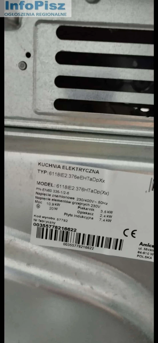 Sprzedam trzy letnią kuchnię indukcje AMICA,stan bardzo dobry. Cena 1250 zl