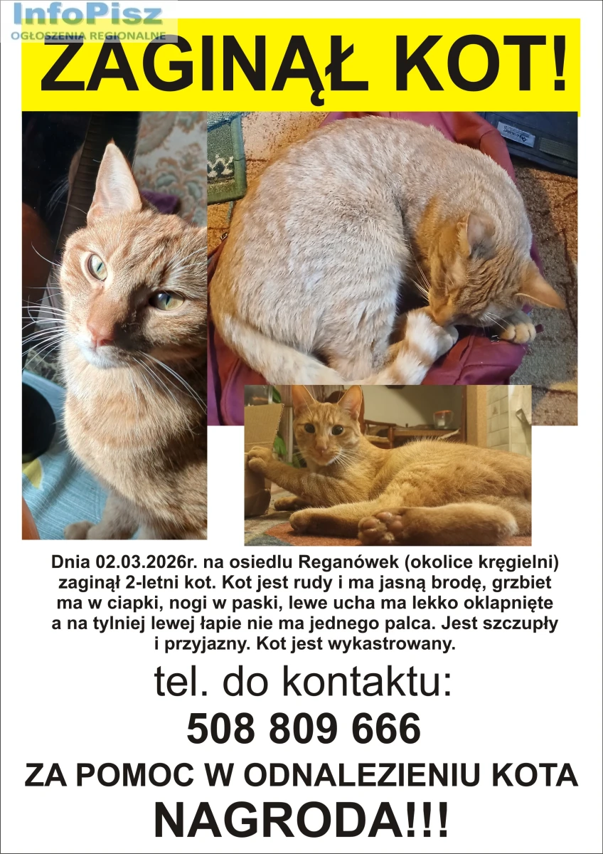 Dnia 02.03.2026r. w Piszu na osiedlu Reganówek (okolice kręgielni) zaginął 2-letni kot. Kot jest rudy i ma jasną brodę, grzbiet ma w ciapki, nogi w paski, lewe ucha ma lekko oklapnięte, a na tylnej lewej łapie nie ma jednego palca. Jest szczupły i przyjazny. Kot jest wykastrowany.